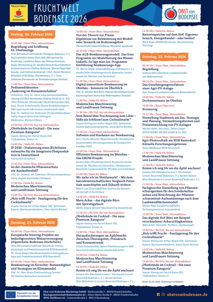 Die FRUCHTWELT BODENSEE findet von 20. - 22. Februar 2026 in Friedrichshafen statt und zählt weltweit zu den größten Messen im Bereich Erwerbsobstbau und Brennereiwesen.